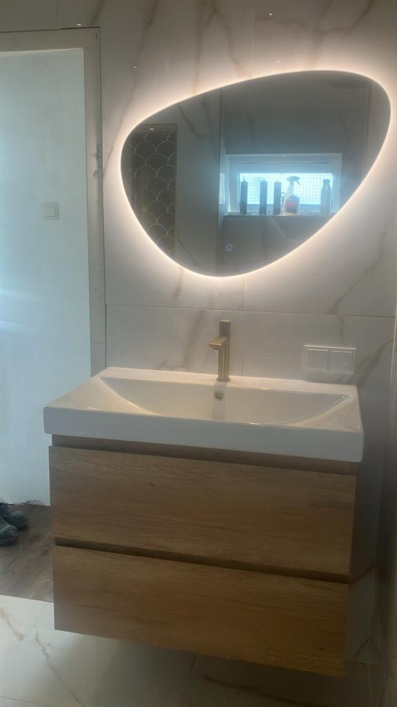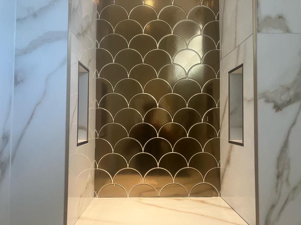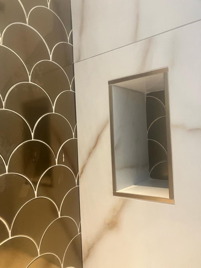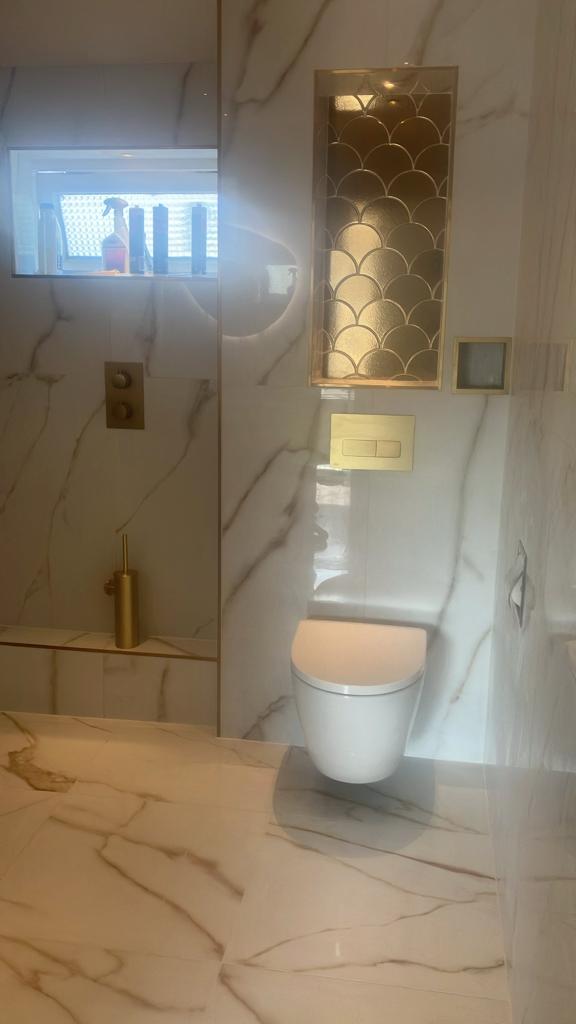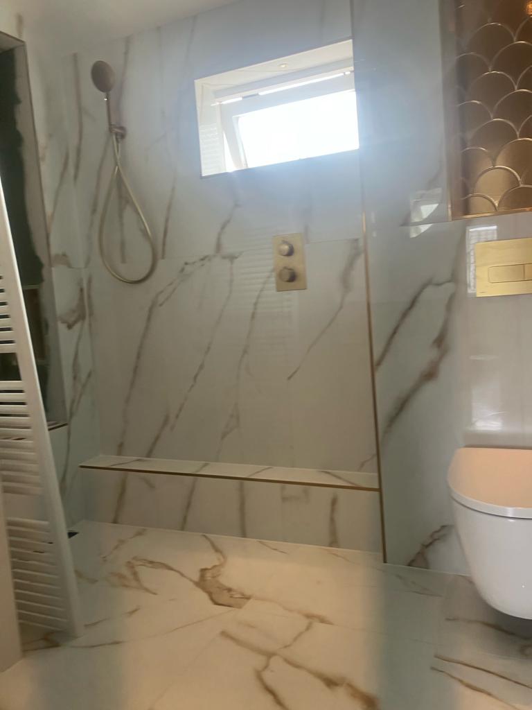 Wit Marmeren vloer met gouden details. Vloerverwarming in de muren, regendouche, en een uniek patroon in de nissen. Kortom een hotel chique badkamer. Tijdens de verbouwing nemen Barend en Bas u mee in alle keuzes die gemaakt moeten worden. Dit zorgt voor een goede samenwerking zodat alle wensen en iedeeën tot uitvoer gebracht kunnen worden. U krijgt dan het plaatje wat u normaal gesproken enkel in woonbladen ziet nu in uw eigen huis