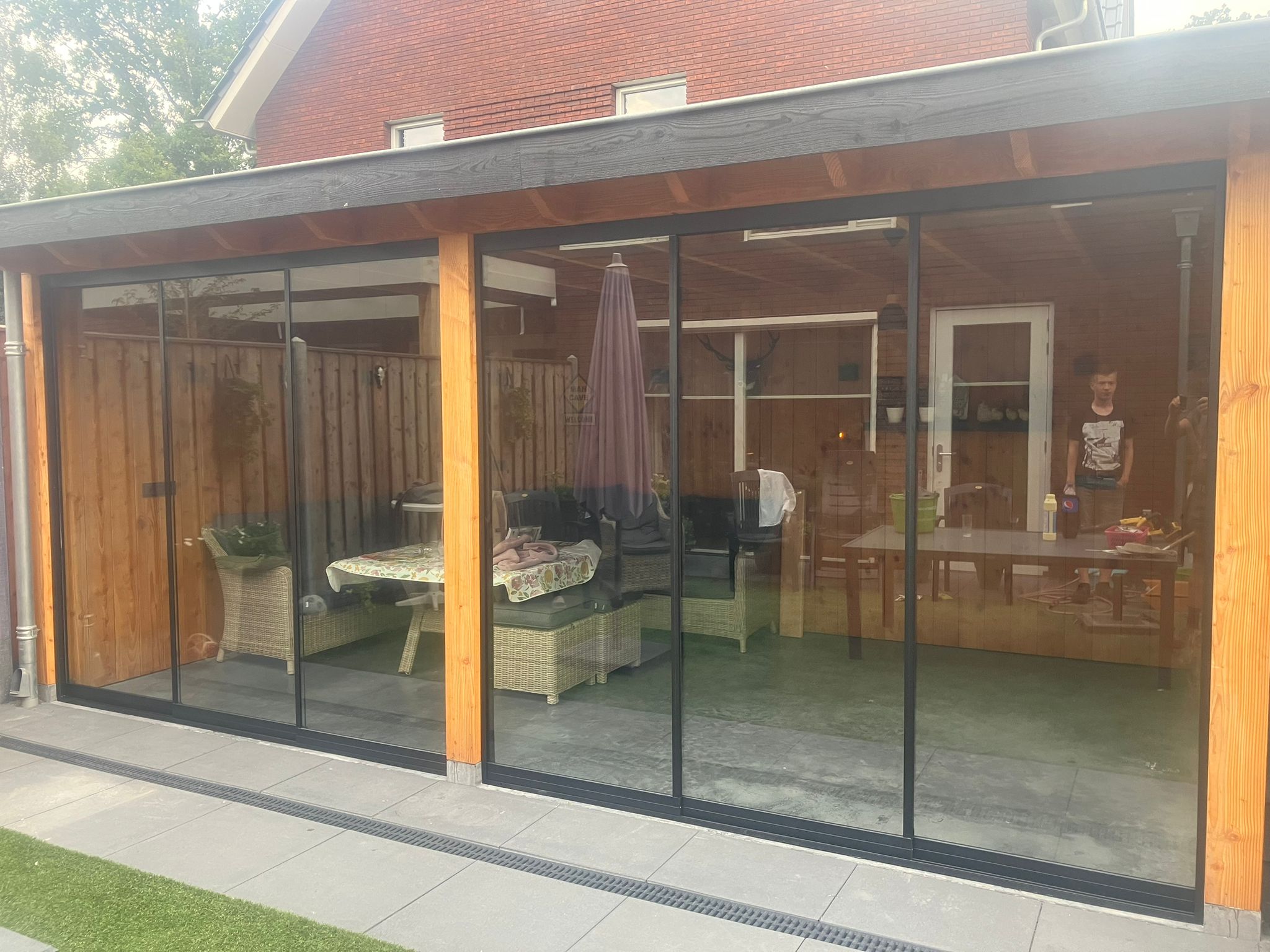 Deze kale tuin in een nieuwbouw wijk is veranderd in een gezellige en sfeervolle tuin met veranda en schuurtje. Deze veranda geeft een nette uitstraling door de sierklossen onder het overstek. Er is bij deze veranda gekozen voor blank Douglas staanders en binnenbekleding met potdeksel zwarte planken aan de buitenzijde van de veranda. Bouwbedrijf van Geresteyn realiseert ook gevlinderde betonvloeren in verschillende kleuren. Deze veranda is nu niet alleen goed schoon te houden, het staat ook nog eens om door een ringetje te halen